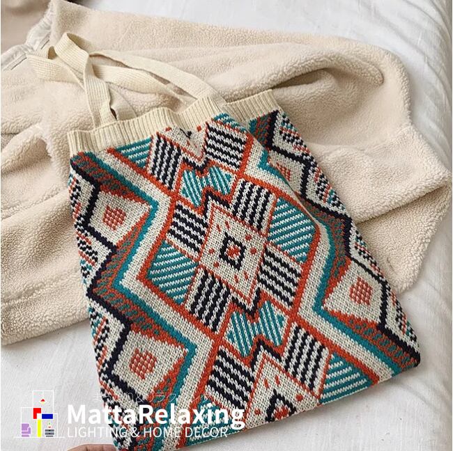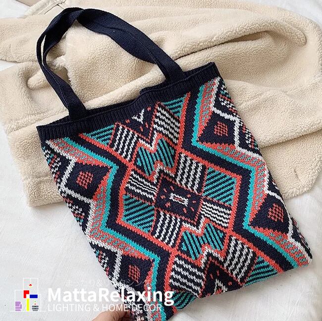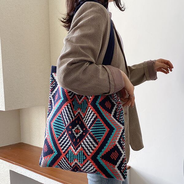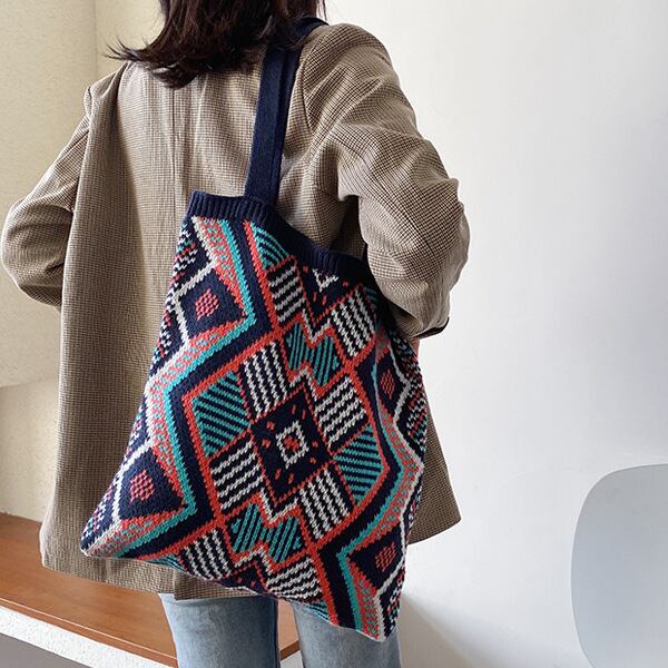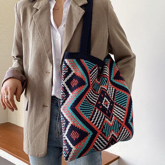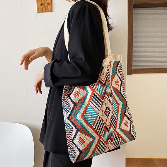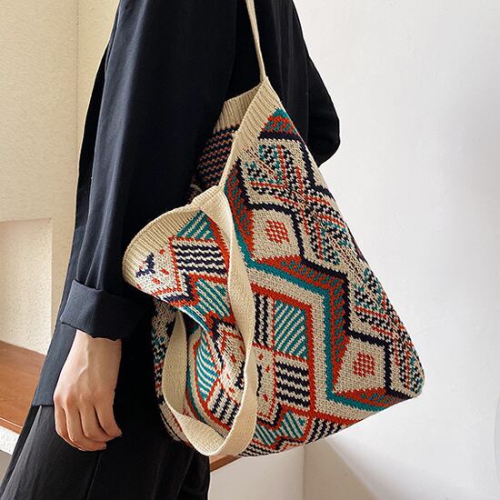 ボヘミアンスタイル、BOHOスタイルのカジュアルな、かぎ針編みニットトートバッグ